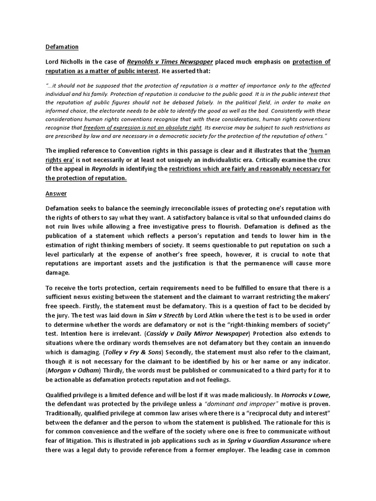 Defamation Law: Libel And Slander Essay Civil and Criminal Defamation Laws. Defamation is a published statement that damages someone’s reputation or holds them defamation Essay. By definition defamation is the act of injuring someone’s character or reputation by false statements. Defamation. The tort law - defamation essay. “A good name smells sweeter than the finest ointment.”. Ecclesiastes The tort of defamation is suffering its own crisis of ‘reputation’. Originally formulated to protect a man’s (sic) ’reputation’ it has in recent years (since we have emerged from Lord Pannick’s ‘Gentlemens’ Club’ mentality1) been the ‘freedom of expression’ counter- argument that has tended to be the focus as Estimated Reading Time: 9 mins defamation Essay Words5 Pages By definition defamation is the act of injuring someone’s character or reputation by false statements. Cases of defamation are only considered attacks on if they are made in a vindictive or malicious manner
